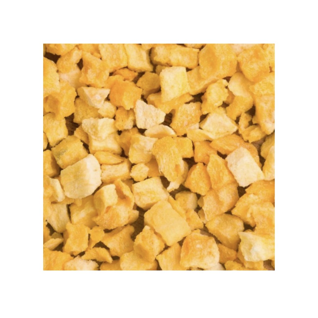 Kousky ananasu sušené metodou lyofilizace si uchovávají plnou chuť, barvu i vůni čerstvého ovoce. Lyofilizace znamená šetrné sušení mrazem, při kterém se z ovoce odstraňuje voda...