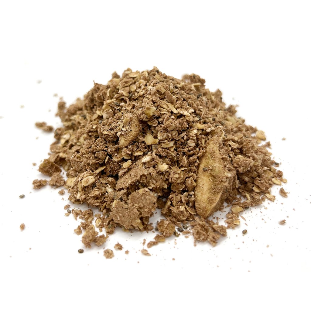 Složení: | bezlepkové ovesné vločky s klíčky, banán sušený mrazem 31 %, kokos 13 %, chia semínka 6%, kakao 3 %. |
