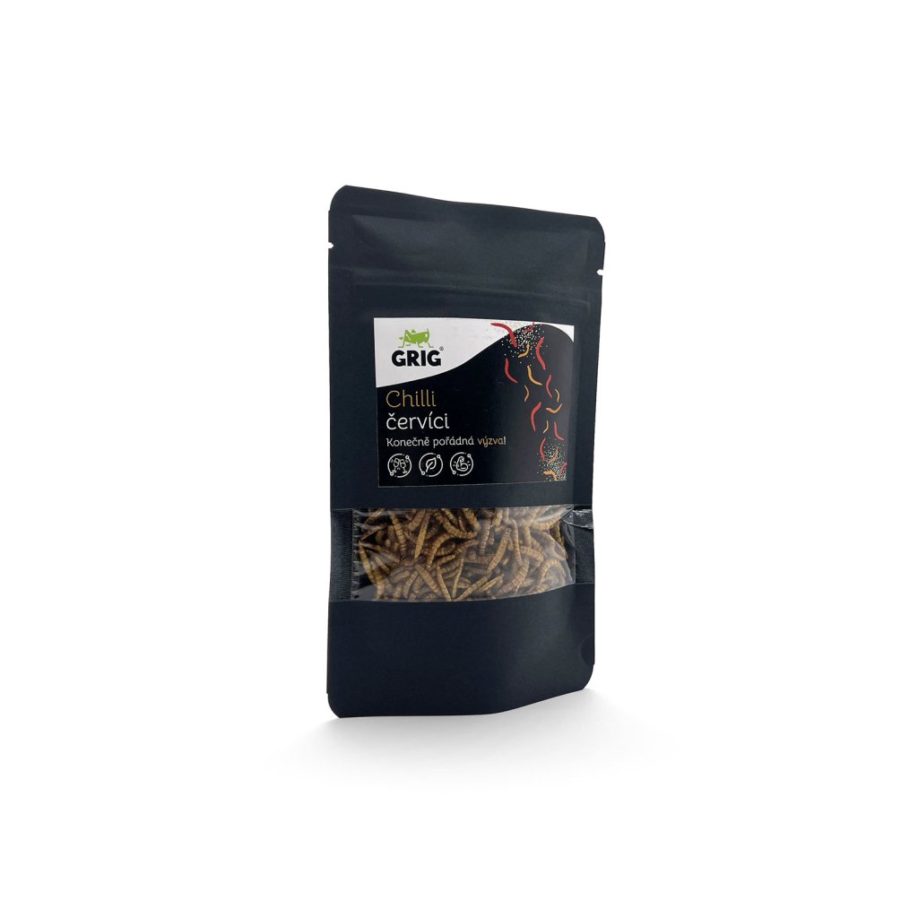 Složení: | larvy potemníka moučného (Tenebrio molitor) 96,2 %, sůl 3,1 %, chilli 0,5 %, směs koření 0,2 % |